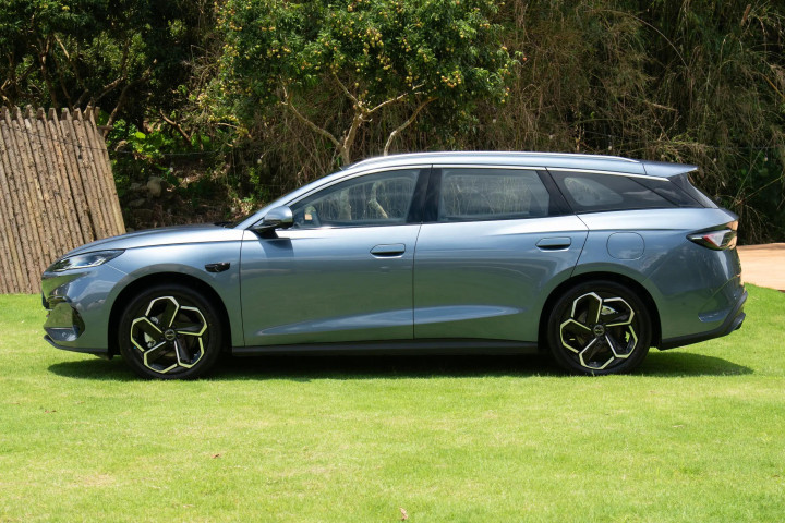 车辆侧面是该车的最大看点,采用常规旅行车造型,平缓下压的车顶线条使整个车身更显修长,同时充分照顾到后排头部空间,也提升了后备厢的装载能力,车顶行李架堪称旅行车的最佳拍档,进一步增强实用性。熏黑的CD柱营造出悬浮式车顶的视觉效果,车窗上边框还插入了银色饰条,半隐藏式门把手不会缺席,搭配上花瓣状的双色低风阻轮毂,既能降低风阻,又有着不错的时尚感。